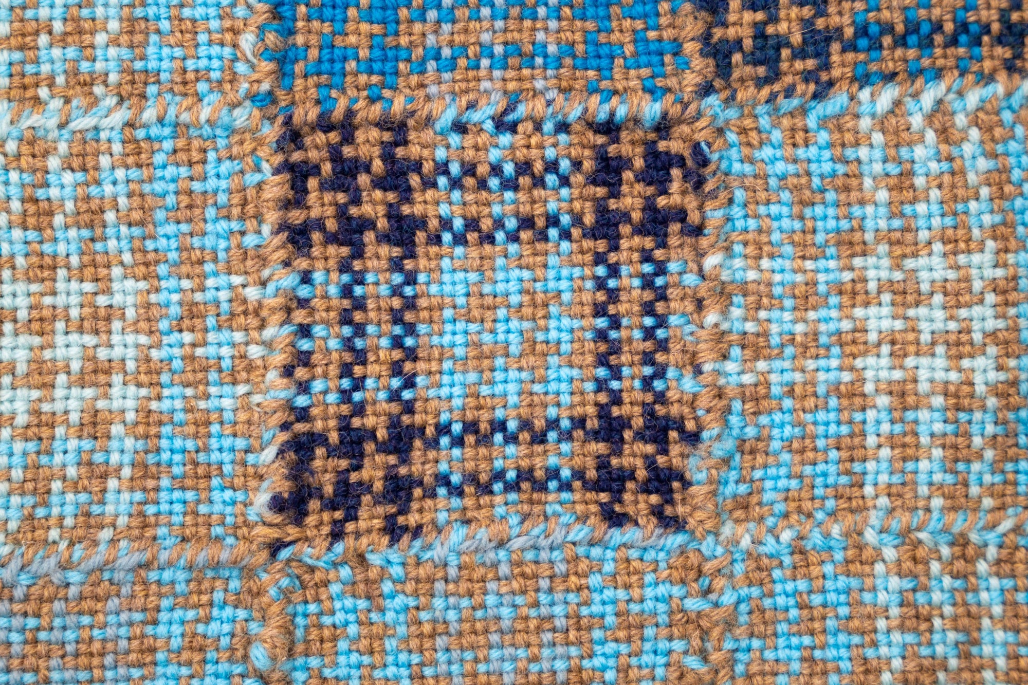 I competed the final 365th daily square shortly after the beginning of 2023. At this point, more decisions needed to be made. There wasn’t a good way to divide 365 squares into a blanket-shaped rectangle. So, I added 13 squares to bring the total to 378, allowing me to make a blanket 18x21 squares across. I used these extra squares to represent additional pieces of data: with four squares I added cross stitch patterns to a plain weave to represent the two equinoxes and two solstices; with one square I cross stitched the location and year of the data on a plain weave square; and with the remaining eight squares I cross stitched the specific temperature range on top the matching yarn color to provide a color-temperature legend. For assembly, I chose a simple whipstitch, joining the squares diagonally, beginning with January 1st in the top left corner and ending with December 31 in the bottom right corner.