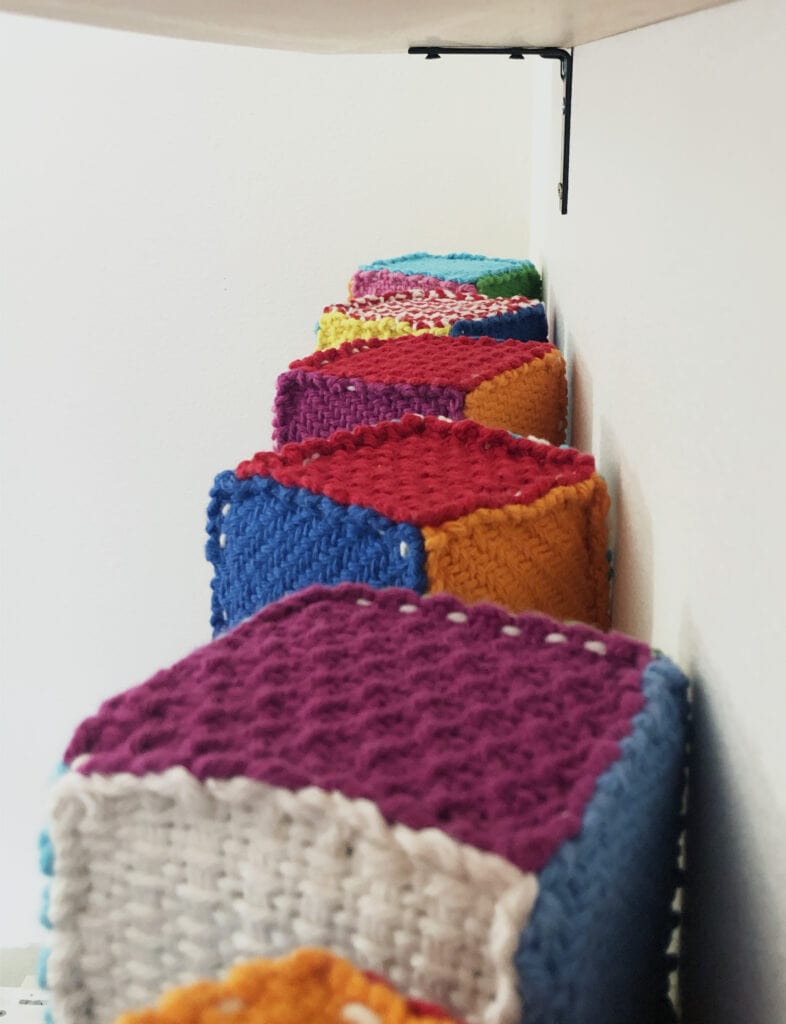 Cotton yarn can be a challenge to weave with on a Zoom Loom, as it has no stretch. It’s worth the effort to use cotton for these blocks, though: they can easily be washed and are comfy to squeeze.