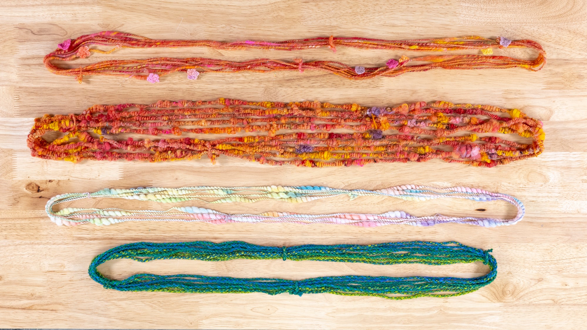 - Core yarns: handspun with extra twist added, crochet cotton, commercial laceweight wool or mohair—something with a bit of "grip" that passes the snap test.