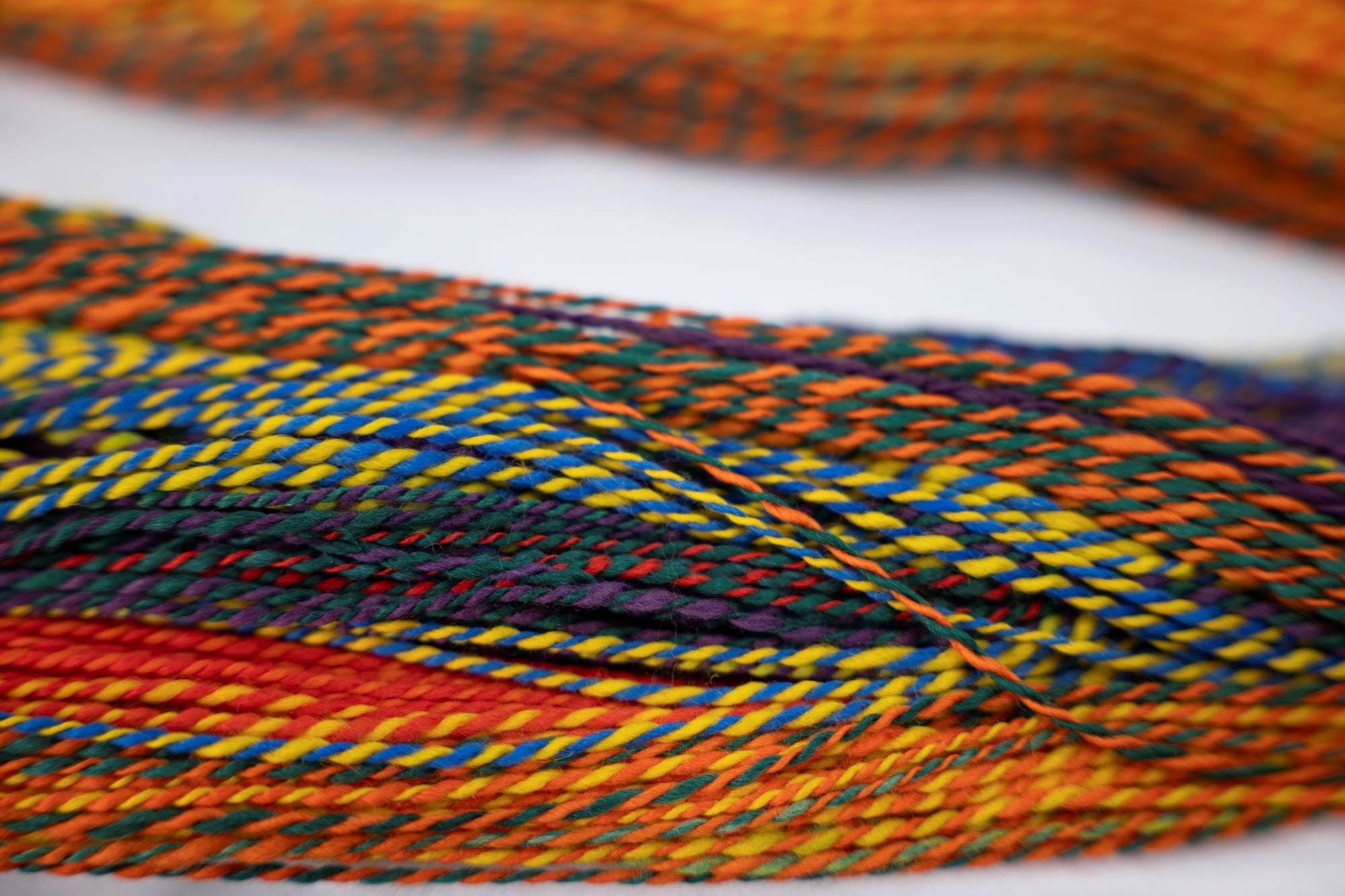 I came across these rainbow merino braids at a farmers market in North Carolina while visiting friends for the weekend. I loved how vibrant they were, and I knew I wanted to get two braids so I’d have enough for a generous woven shawl. I decided to go with a fractal technique because I love the variety and rhythm it creates in the color repeats.