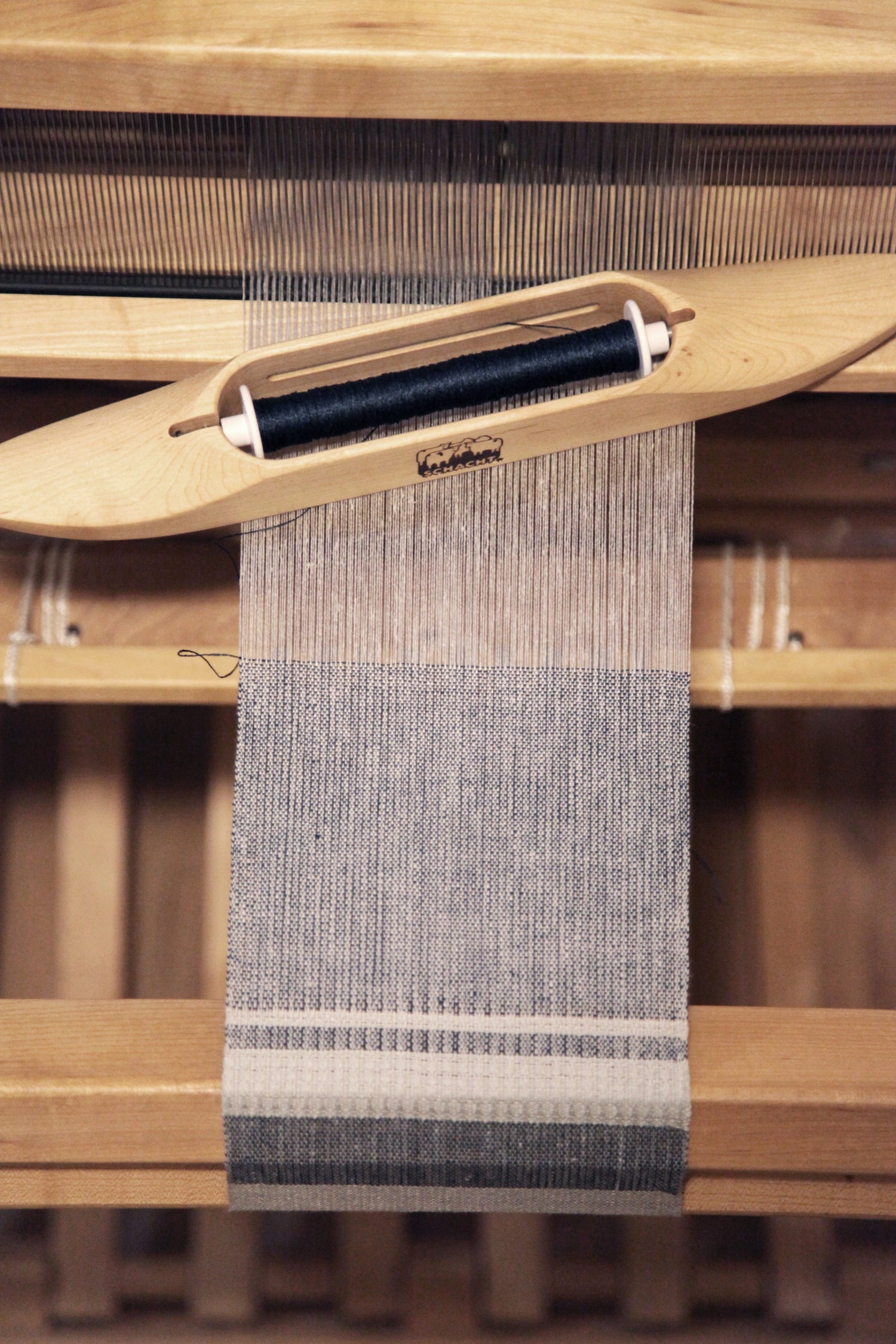 Wind a warp chain in Cloud, 182 ends including floating selvedges. Use your preferred waping method to warp the loom following the pattern draft. Sley the reed for 30 epi, centering the 6" weaving width in the reed.