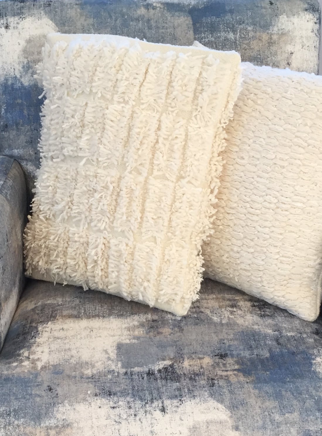 I gathered up all of my white and off white yarns in various sizes and textures and fiber content and put them together for the pattern (pile) weft. For warp, I used Navajo rug warp from Brown Sheep Company and for the plain weave pillow backs, I used the same Navajo rug warp in combination with novelty yarns.