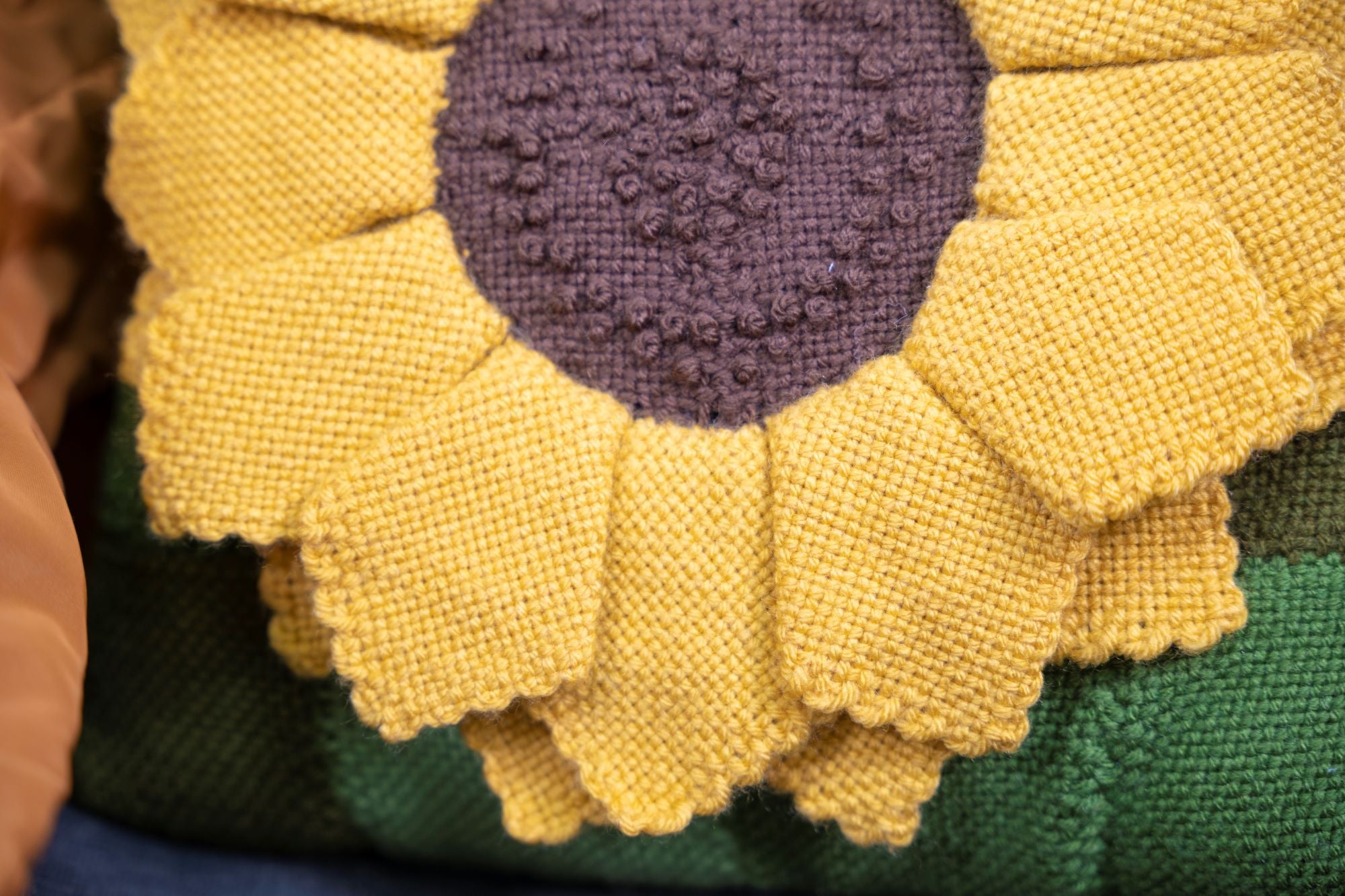 The pillow itself is created separately, with the flower sewn on top. I pulled out all the greens I had from Lion Brand’s Vanna’s Choice to create a fun patchwork of color for the pillow. All-in-all, this pillow is a really convenient size for decorating a couch or bed, or wherever you want a sunny splash of color.