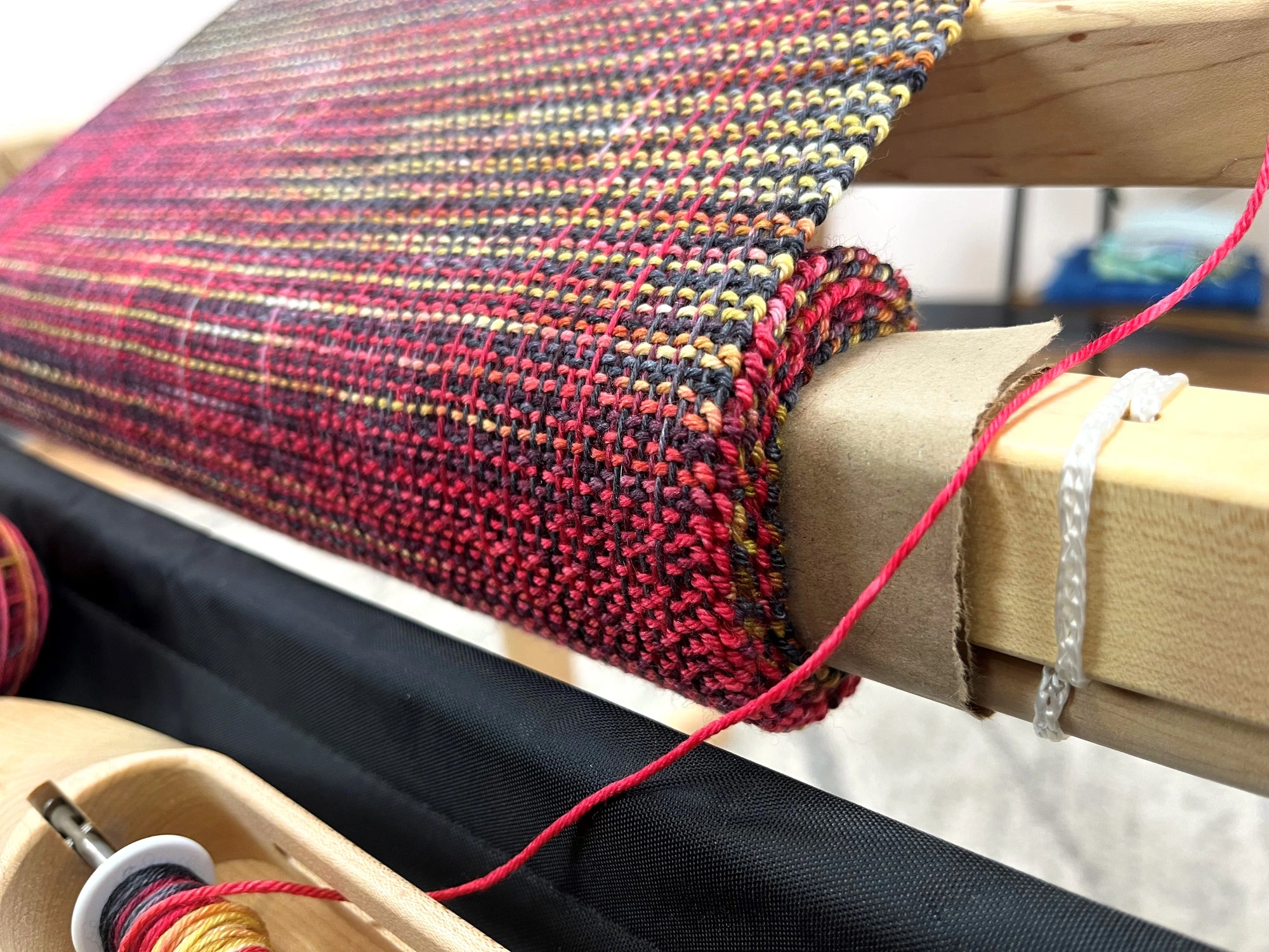 Weave the 4 rows of the pick-up pattern until you have about 13" of warp left from the fell of the fabric to the apron bar.