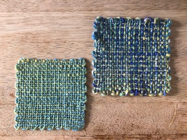 If you reuse handspun from a knitted or crocheted swatch, wash or steam out the yarn before weaving! It’s harder to get even tension with kinky yarn.